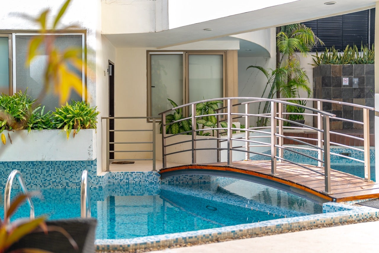 Sliding doors open onto two private balconies with pool view, enhancing airflow and providing a relaxed indoor-outdoor atmosphere.