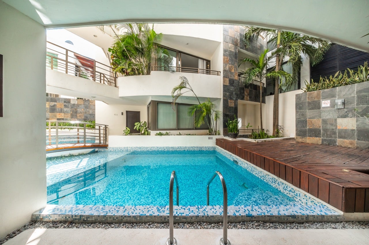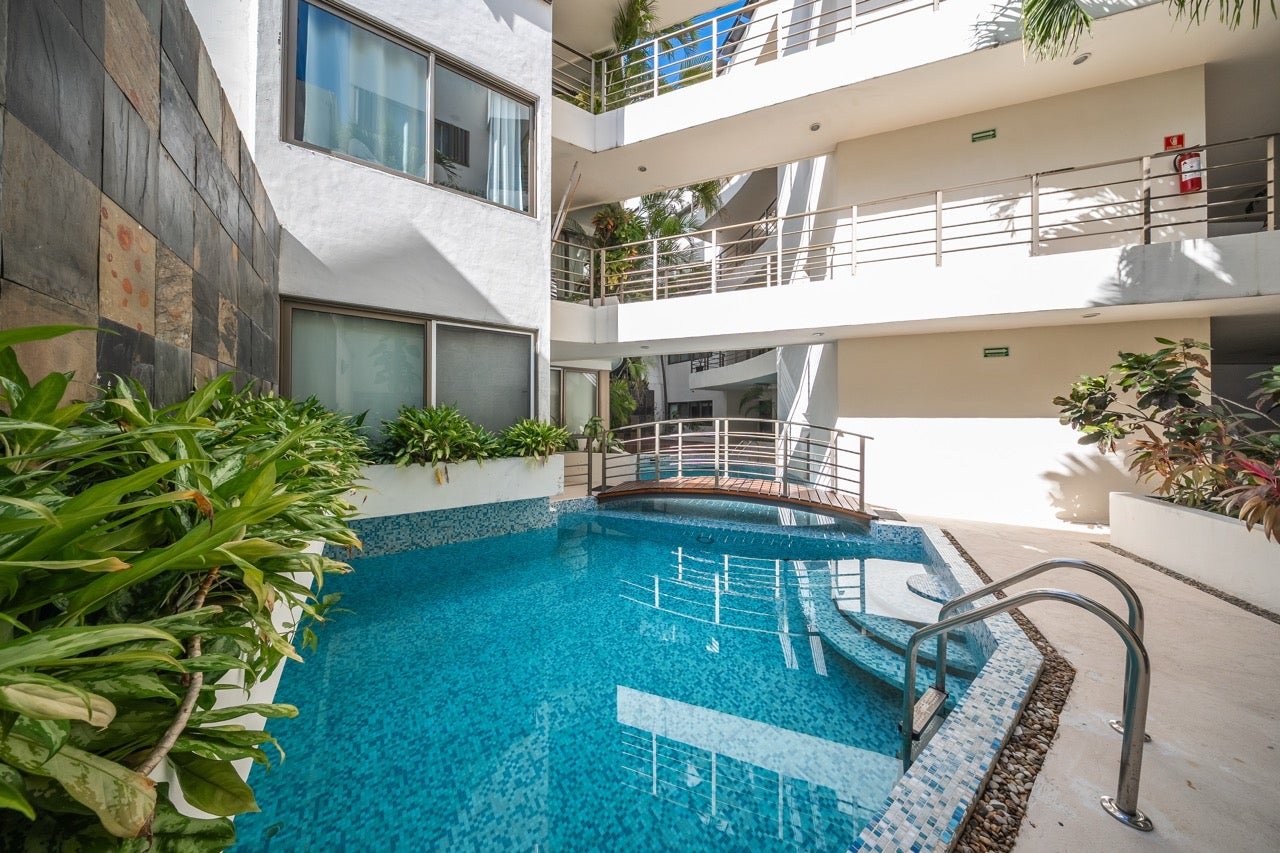Modern 1-bedroom condo for sale in Zazil-Ha, Playa del Carmen. Pool view, parking, steps from beach & 5th Avenue, quiet street, strong rental history.