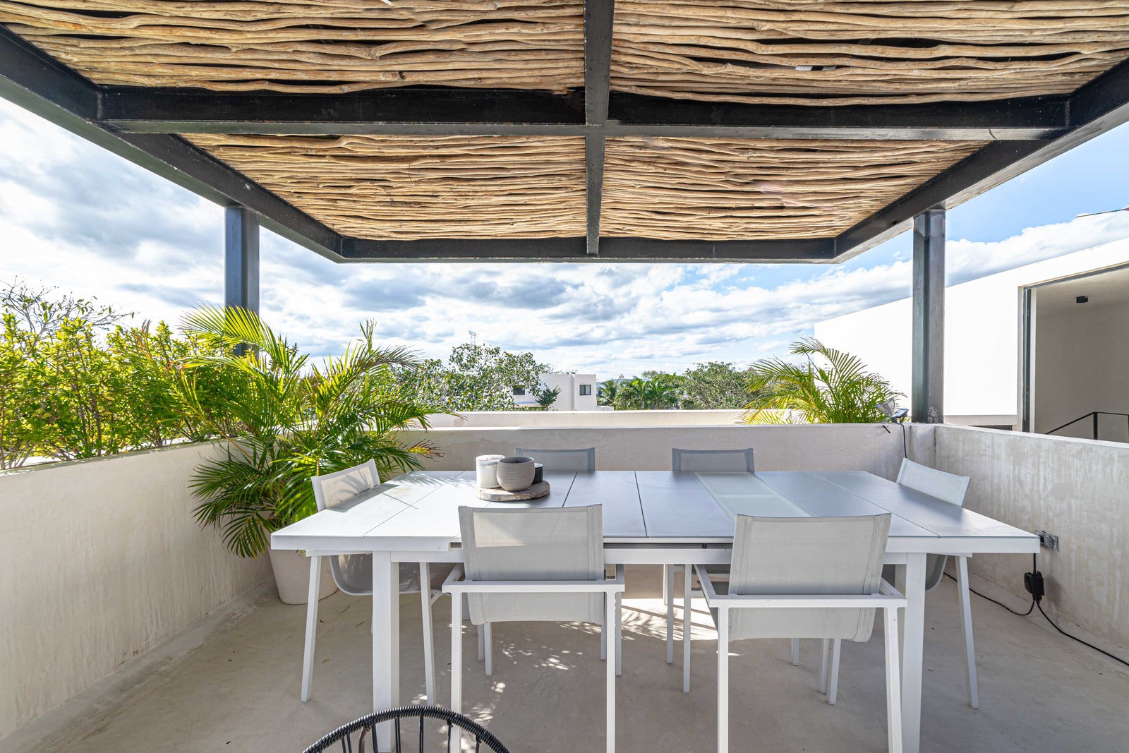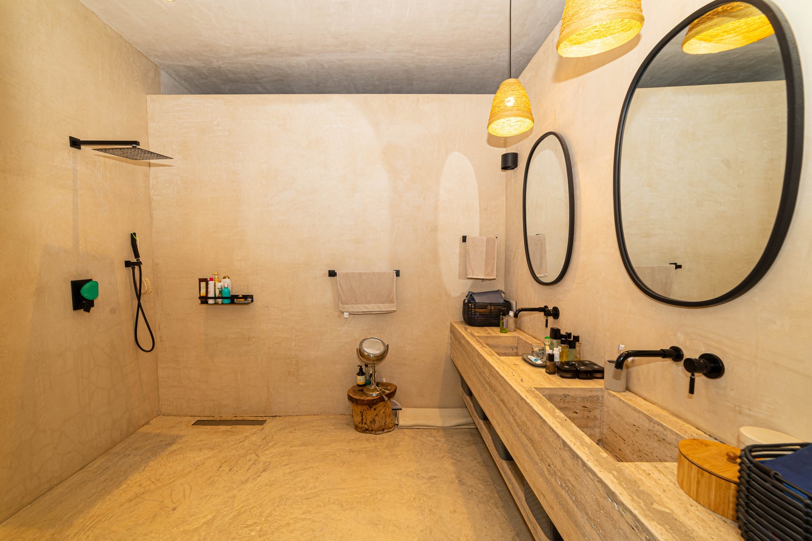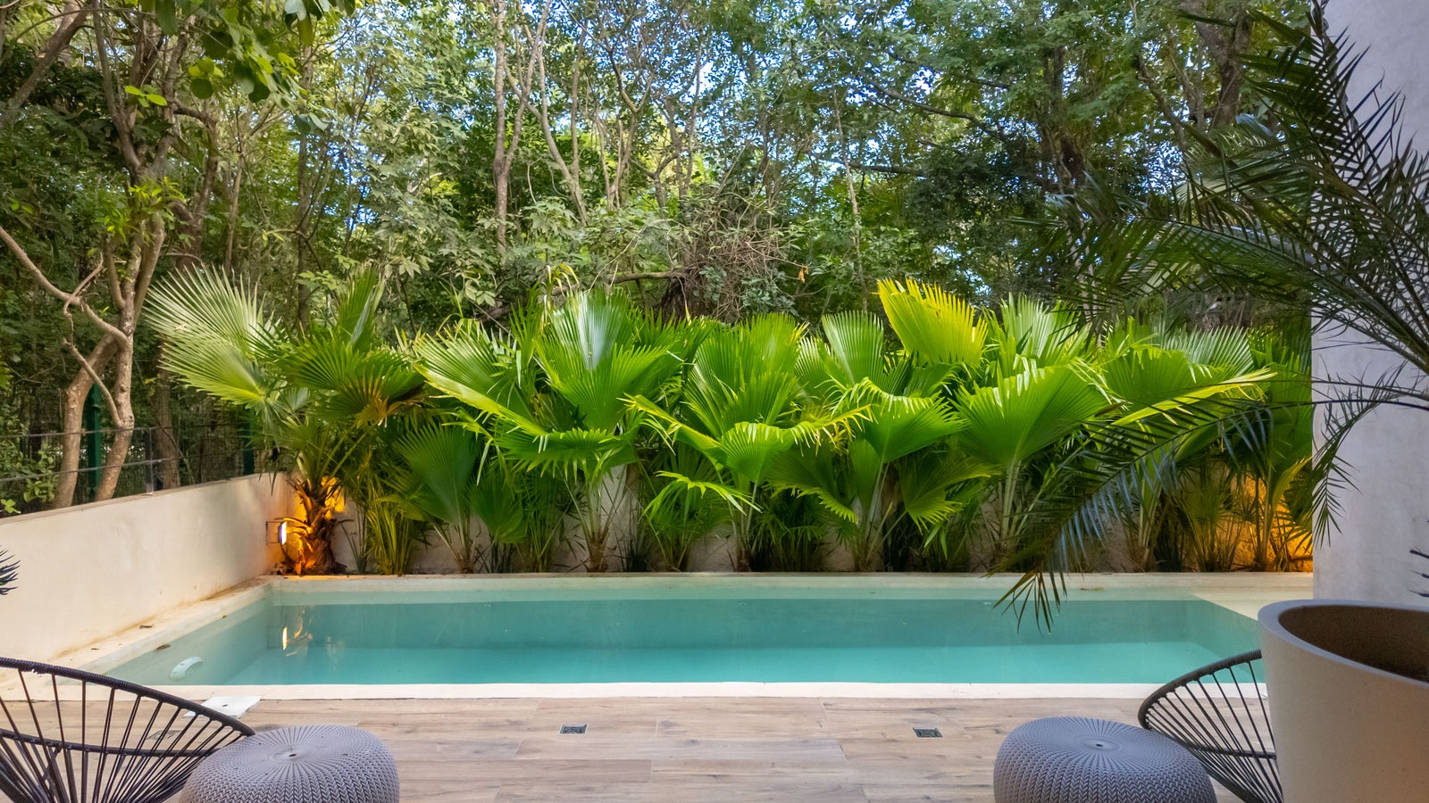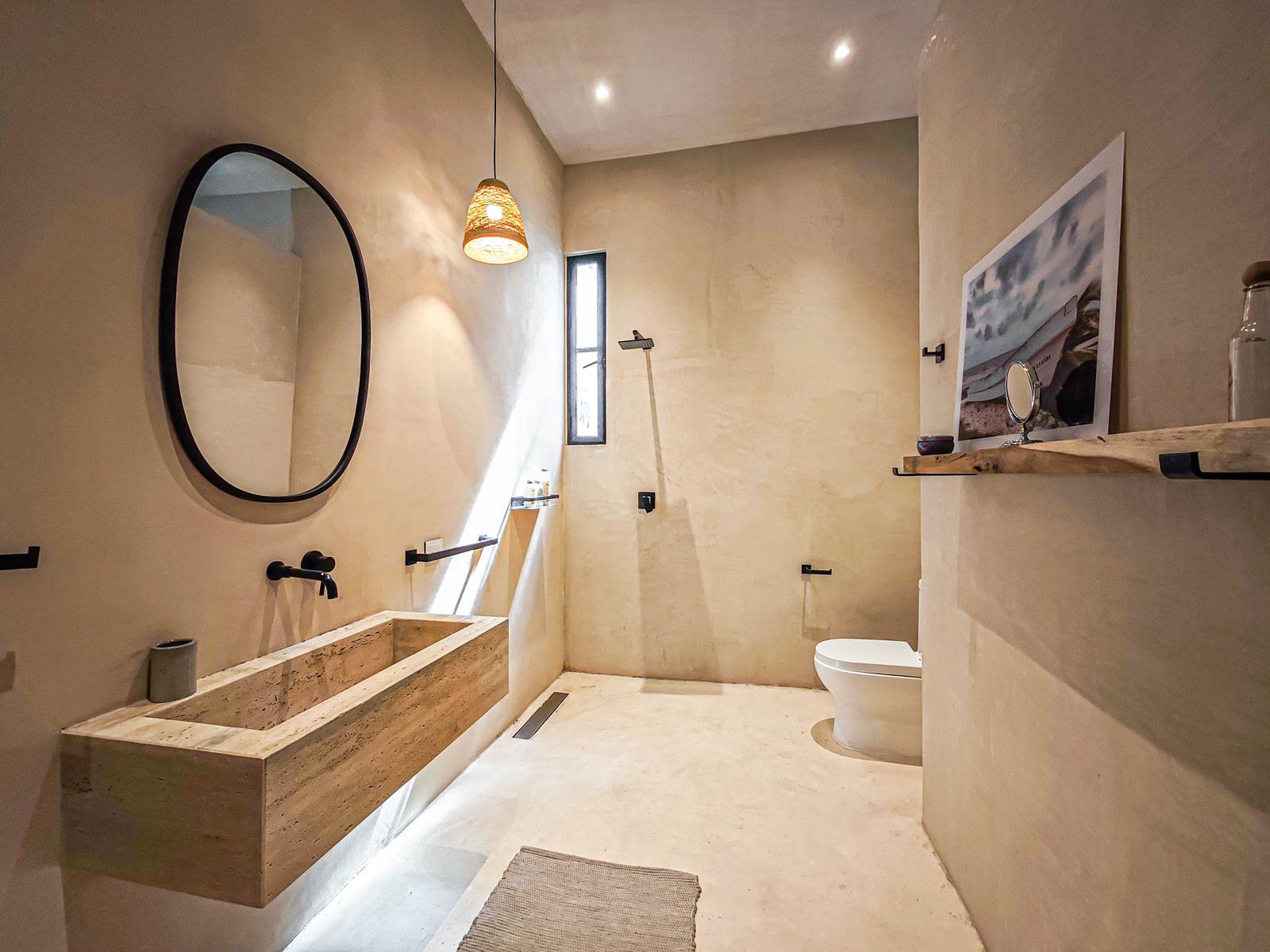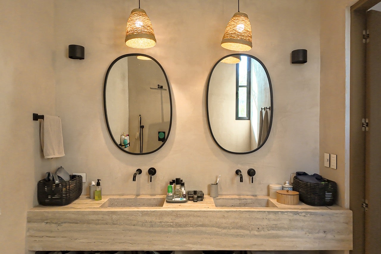 High-quality materials such as Mayan stone, travertine marble, microcement finishes, and solid South American wood carpentry enhance the design of the villa, while solar panels and LED lighting add sustainability and efficiency.